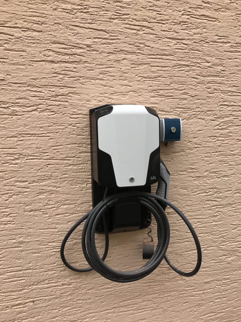 Da die Parkfläche 5,50m breit und 10m tief ist, so das sehr bequem zwei Autos abgestellt werden können, ergab sich dann auch das die üblichen 4m Kabel zu knapp sind. 10m hingegen erschien uns etwas lang, was dann am Ende der Hauptgrund war sich für die ABL 11kW Wallbox mit 7m fest angeschlagenem Typ2 Kabel zu entscheiden. Ein Elektriker aus dem Ort hat sich dann um Verkabelung und Montage gekümmert.