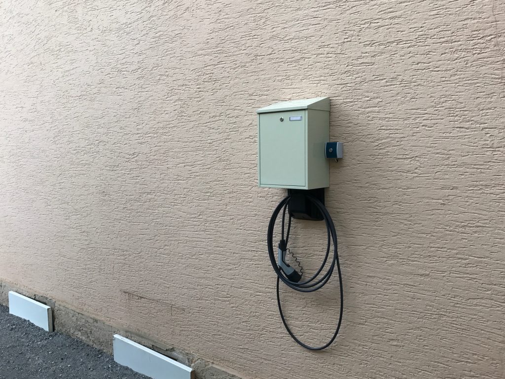 Eine abschließbare und wetterfeste Steckdose kam auch direkt daneben. Zum einen um auch mit dem Schuko-Notladekabel laden zu können falls es mal nötig wird, zum anderen kann eine Steckdose nie schaden. Gerade an einem Parkplatz kann man Licht oder einen Staubsauger gut gebrauchen.