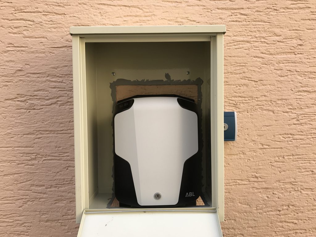 Wetterfest ist dann aber auch direkt das Stichwort - im Kleingedruckten schreibt ABL dass die Box zwar durchaus Staub- und Wassergeschützt ist, aber bitte dann doch nicht ungeschützt montiert werden soll. Da war guter Rat teuer. Wir haben verschiedene Optionen durchgespielt, aber die Lösung kam dann aus dem GoingElectric Forum: einfach einen großen Briefkasten kaufen, die Rückseite raustrennen, und über die Wallbox setzen.
