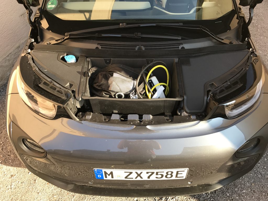 Vom Kofferraum haben wir kein Foto gemacht, er ist aber erschreckend klein. Gefühlt passt gerade eine Handtasche rein, aber der Praxis-Test beim Einkaufen ergab: immerhin Platz für drei Wasserkisten. Dann ist aber auch voll, und 1.5l Flaschen sollten es möglichst auch nicht sein. Der Frunk, also der kleine Laderaum unter der vorderen Haube, hingegen ist sehr praktisch, den werden wir beim e-Golf sicher vermissen. Ein idealer Platz um die Ladekabel unterzubringen, und den Kofferraum voll nutzbar zu haben.