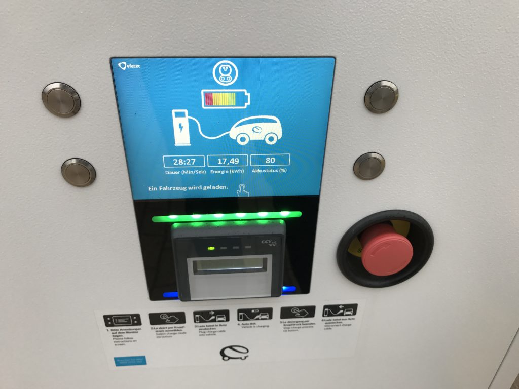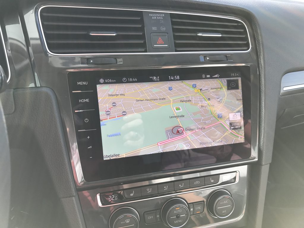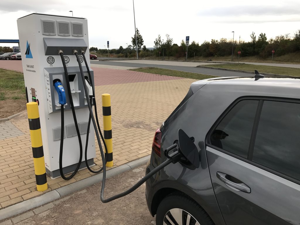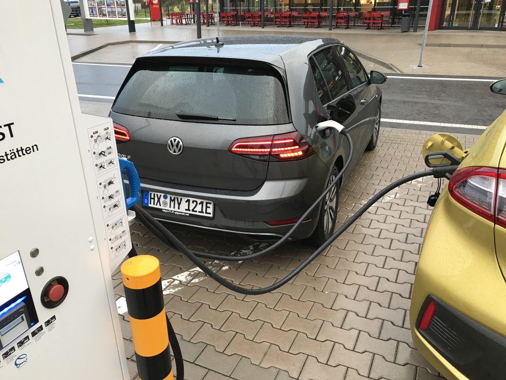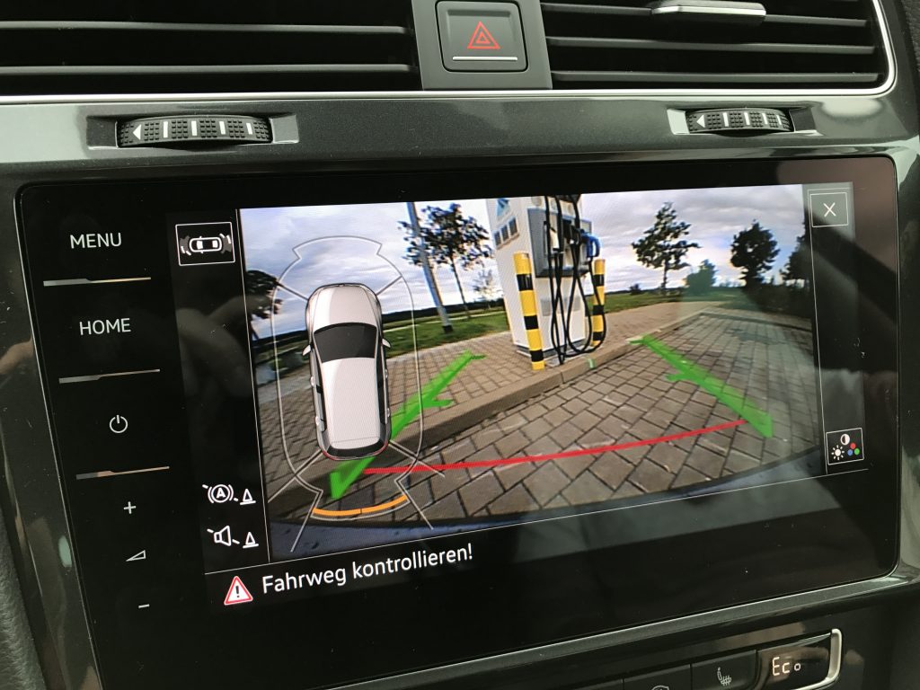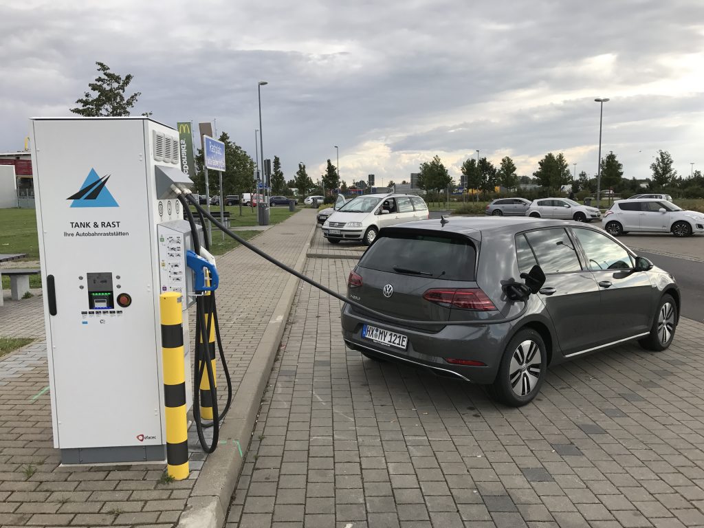 Die Ankunftszeit 18:44 konnten wir nicht ganz halten, soviel sei schon verraten. Die ersten Meter gingen durch den Dresdener Stadtverkehr, und dann “endlich” auf die Autobahn. ACC eingeschaltet, 120km/h eingestellt, und los ging die eigentliche Fahrt. Das Auto macht Spass, und in gefühlt 0,nix waren wir dann auch schon beim ersten Ladestop nach knappen 85km Fahrtstrecke. Eigentlich etwas früh zum nachladen, aber wir kannten das Auto noch nicht, und wollten uns nicht durch Reichweitenangst stressen lassen. Ausserdem will man ja das Schnellladen ausprobieren! Die Rückfahrkamera scheint jedenfalls auch eine gute Idee gewesen zu sein, man muss ja mit dem e-Golf rückwärts an die Ladesäulen ranfahren, und das Kabel bei den Schnellladern ist recht kurz.