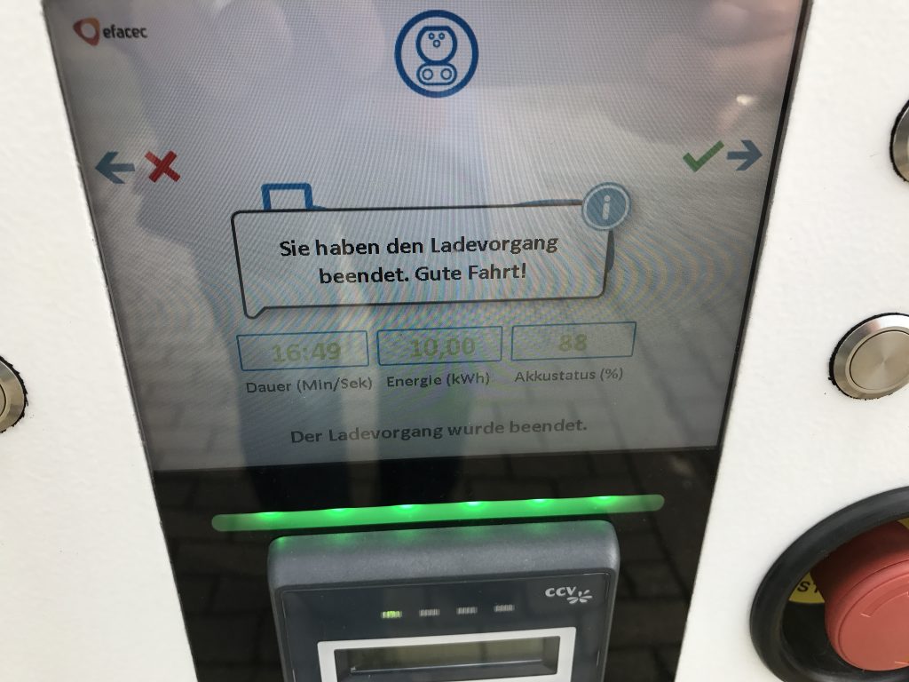 Mehrere Passanten schauten interessiert rüber und tuschelten, aber angesprochen hat uns dann doch niemand. Etwa eine Viertelstunde später war der Akku bei 88%, 10kWh haben wir nachgeladen. Danke an Tank & Rast, gerne wieder!