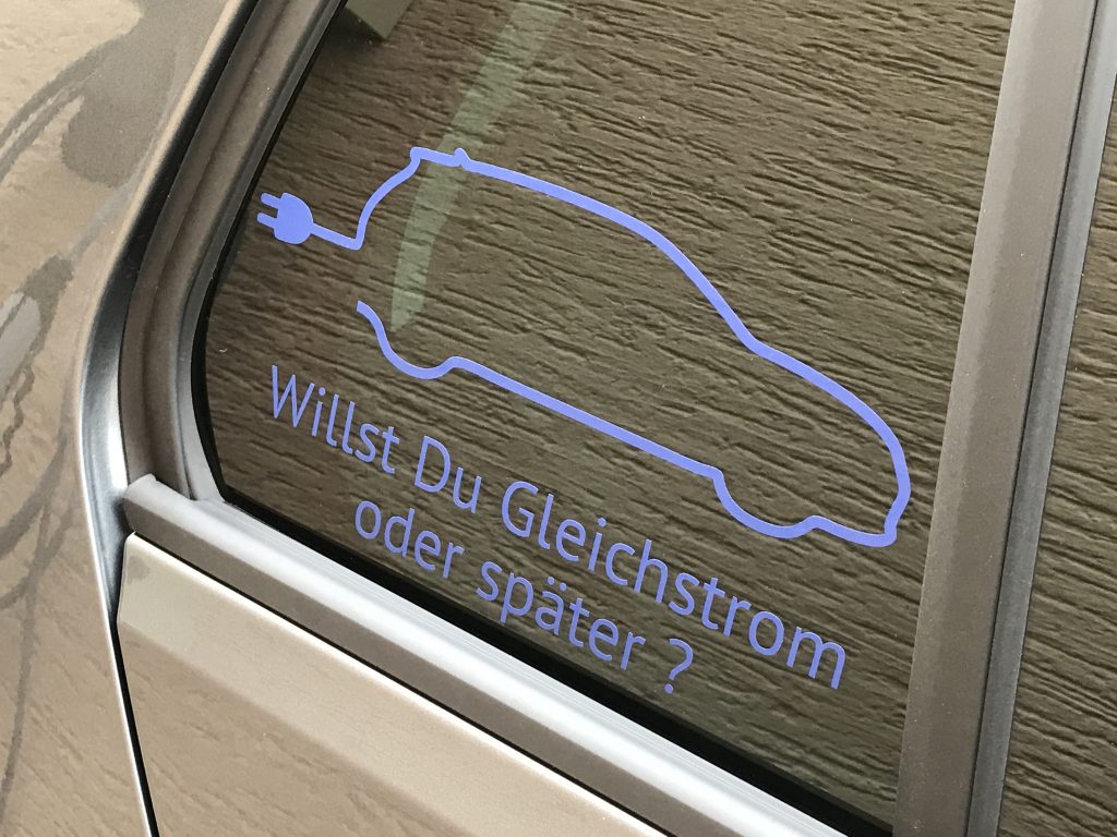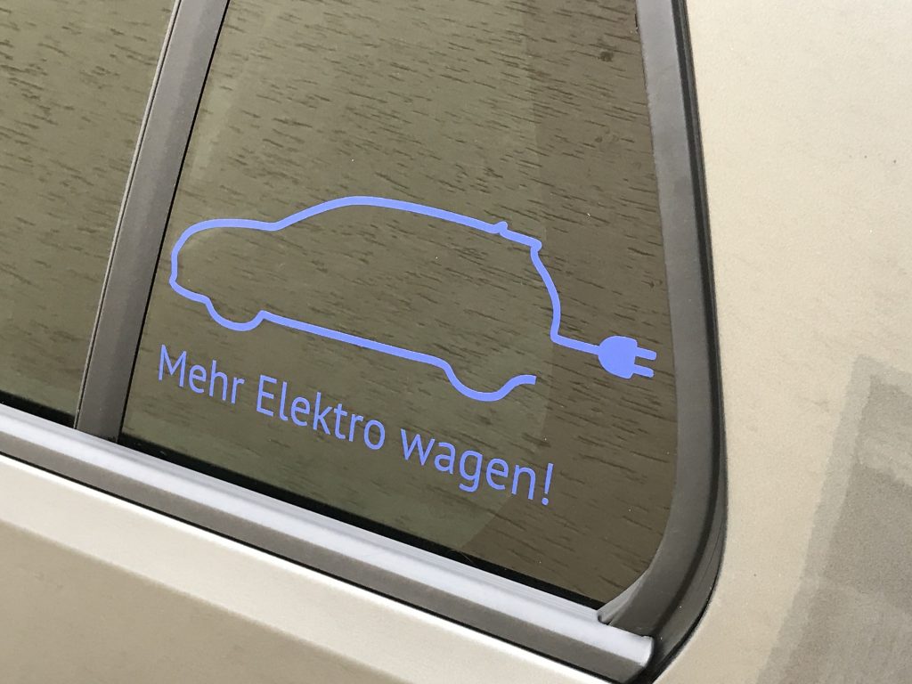 Zwei Kleinigkeiten haben wir beim e-Golf recht zeitnah “angepasst”. Zum einen wollten wir, trotz der Tarnfarbe und der generell eher unscheinbaren Optik des Wagens, dezent aber sichtbar darauf hinweisen das es ein Elektroauto ist. Basierend auf dem Logo das Steffi für unsere Webseite gemacht hat haben wir zwei Aufkleber für die hinteren Seitenscheiben entworfen. Ich finde die machen sich recht schick. Die Farbe entspricht dem Blau welches VW auch für das “e” im e-Golf Logo am Heck bzw. den Zierstreifen an der Front verwendet hat.