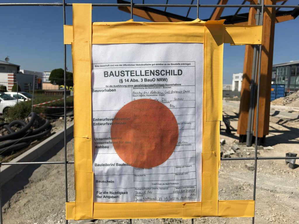 Eine Baustelle! Für etwas dessen Dachkonstruktion verdächtig nach einer Fastned Ladestation aussieht. Und in der Tat, das Baustellenschild verrät es dann: