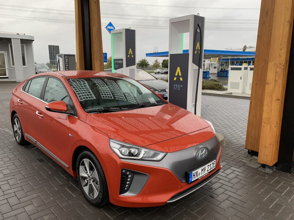 Nach dem Fahrsicherheitstraining haben wir gestern noch die neue Fastned Station in Paderborn Mönkeloh ausprobiert. Wunderbare Sache, 3 Schnelllader auf einem Haufen, und wie man auf dem Bild sieht: echt gut so ein Dach bei Regen. Den Ioniq haben wir an eine der beiden 175kW Säulen gehängt, da gings dann gut zur Sache. Für den Golf haben wir den “normalen” 50kW Lader genommen.