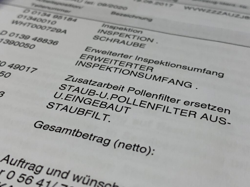 Die 30.000er Inspektion haben wir bei 29.765km gemacht, also fast eine Punktlandung. Die zweite Inspektion, mit “erweitertem Umfang”, war dann genau ein Jahr später fällig, nach weiteren 26.000km. Wie “erweiterter Umfang” nahelegt war jetzt auch etwas mehr zu tun, und es wurden statt 121 EUR dann 214 EUR fällig. Verglichen mit den Inspektionsrechnung der früheren Diesel-Fahrzeuge aber immer noch sehr günstig. Etwa die Hälfte der Mehrkosten geht auf den “erweiterten Umfang”, wobei ich nicht genau sagen kann was da mehr gemacht wurde. Der Rest entfällt auf den Pollenfilter, der getauscht wurde. Das kann man im Zweifel aber auch selbst machen, falls man noch etwas sparen will.