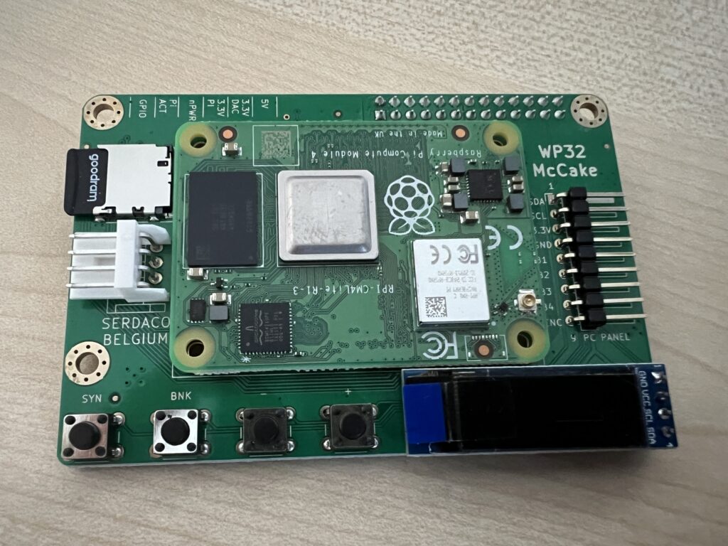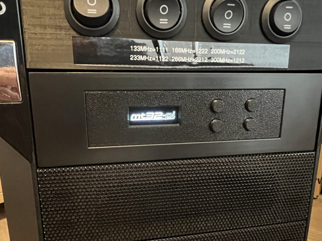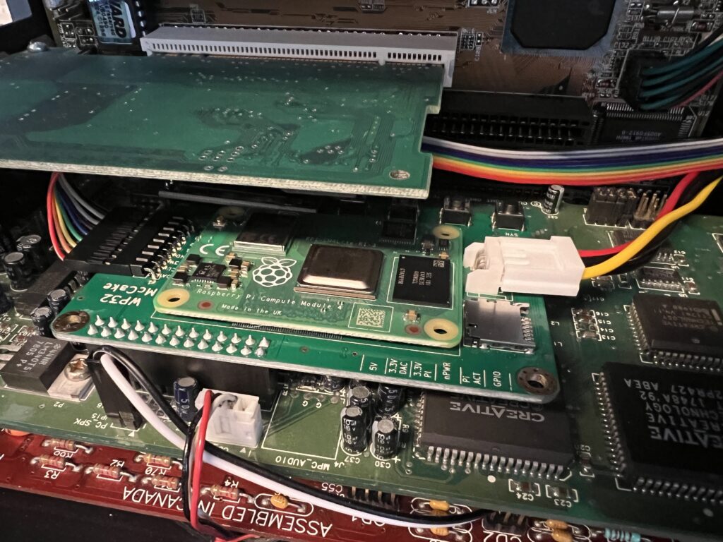 Bei dem System handelt es sich um eine kleine Platine, die einerseits auf den Waveblaster-Port einer Soundkarte gesteckt wird, und andererseits dann ein Raspberry Pi Compute Module 4 bedient. Auf diesem läuft dann die schon erwähnte MT32-Pi Software. Auf der Trägerplatine sind auch 4 Buttons und ein OLED-Display zu finden, sowie ein hochwertiger DAC für die Erzeugung der analogen Audiosignale. Die Buttons und das Display gab es auch auf der “echten” Roland Hardware, hier werden die Buttons genutzt um zwischen den verschiedenen Sound-Emulationen zu wechseln, die Lautstärke anzupassen, und die gleichen Informationen anzuzeigen wie schon die originale Roland Hardware. Als Stromversorgung dient der Floppy-Power-Anschluss links im Bild, gebootet wird von der SD Karte darüber.